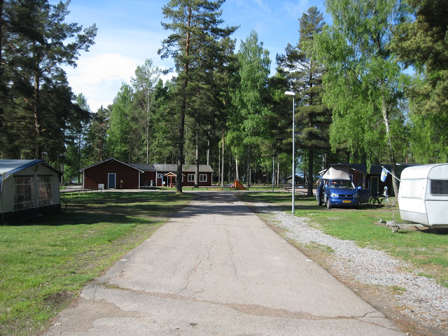 Om 7 uur loopt de telefoonwekker af. Even later komt de boordradio er achteraan. Om half 8 zitten we aan het ontbijtbuffet en ergens tegen tien voor negen begeven we ons richting autodek. We staan bijna vooraan. De klep gaat in plaats van om 9.00 uur pas ruim een kwartier later open. Via de hoge brug van Göteborg gaan we buitenom richting de E6 naar het noorden. In Kungälv even de weg af voor een beperkte hoeveelheid boodschappen in een héééle grote supermarkt (ICA Stormarknad). We vervolgen daarna de E6 tot Uddevalla, waar we weg 172 inslaan. Tegen het middaguur stoppen we in Hogsäter voor een korte siësta en een lunch. Voorbij Gustavsfors maken we een omweg via een onverharde weg naar Blomskog. Daar stoppen we bij een kerkje aan een meer. Het is inmiddels even zonnig geworden, dat voelt best wel prettig. Via een echte asfaltweg rijden we weer naar weg 172 en vervolgen die tot Årjäng. De Sommarvik- camping ligt buiten de stad en de plaatsen zijn nogal open. Omdat het begint te onweren en te hagelen besluiten we door te rijden naar Glaskogen, om midden in het natuurgebied op de camping van Lenungshammar een plekje te zoeken; dat is wat meer beschut. Het wordt ondertussen weer droog. Na een lange rit over onverharde modderwegen komen we met een deels blauwe, deels modderzwarte camper na vijven bij de camping aan, die dus van 10.00 tot 14.00 uur open is. De caravanplekken verderop in het bos hebben afgesloten stroomkastjes, dus is er geen stroom voor onze kachel. We rijden via een “normale” weg richting Glava en proberen daar een natuurplekje van vroeger te vinden, wat niet lukt. Dan maar door naar Arvika, waar we uiteindelijk na zessen op de camping belanden. Kantoor is dicht, maar je kunt zelf een plekje zoeken en de volgende dag afrekenen. Hier zijn de stroomaansluitingen wel bereikbaar. Er is één servicehus open, dus gaan we daar vlak bij staan. Koken en dit verslag typen doen we in het Sevicehus. Buiten regent het weer. Het weerbericht op de TV belooft voor morgen niet veel beter. Afwachten maar. Vanavond gaan we maar gewoon lekker lezen (“E-readen”) en morgen zien en rijden we weer verder.