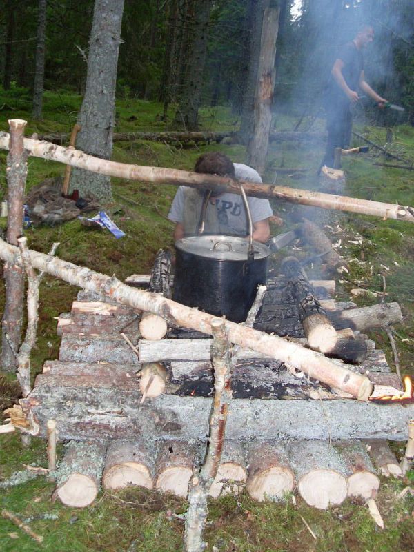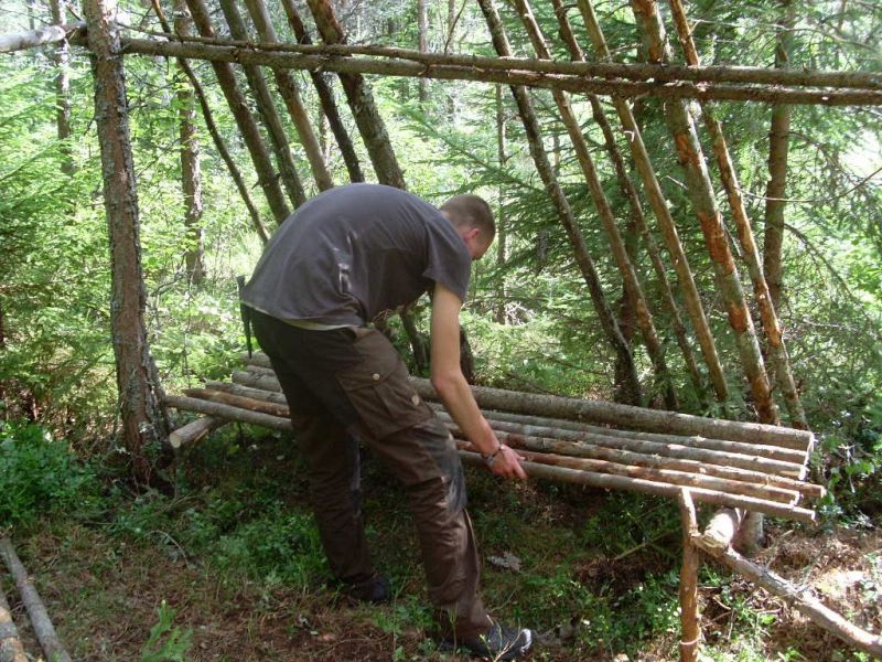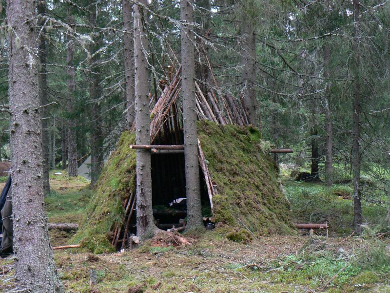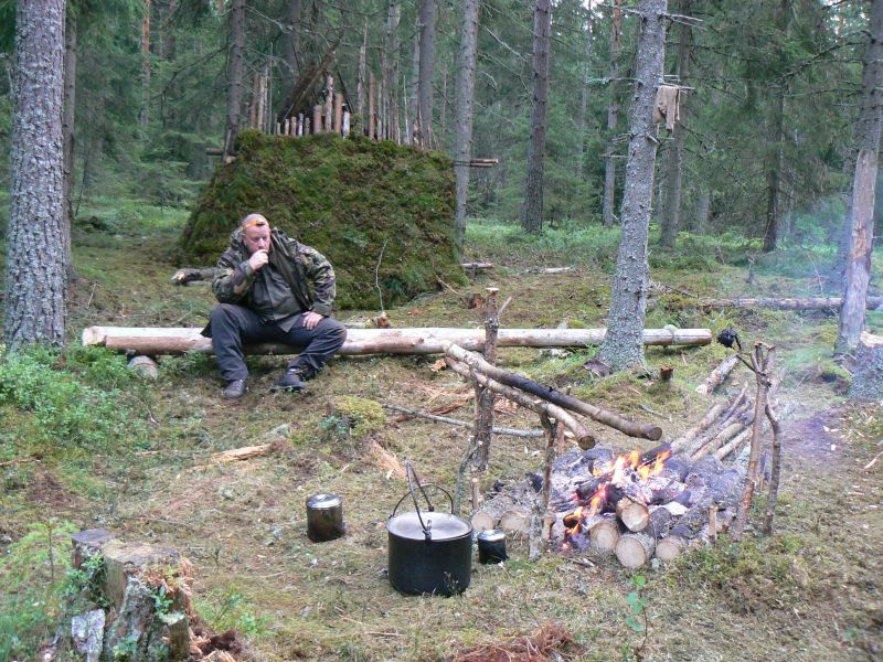 De volgende morgen ontwaakte het kamp langzaam. Echter deden daar 3 zwarte spechten niet aan mee. Ze begonnen hun oorlogsritueel naar elkaar omdat ze in elkaars gebied zaten. Dit zou een dagelijkse ontmoeting worden. De dag bestond uit “leer je eten zoeken van de grond in Zweden” en “bouw je onderkomen”. De jongens vroegen veel en kregen op alles antwoord. Het viel mij op dat ze ook alles gingen vragen. Tijd voor een teammeeting. OK mannen... wij als leiding stappen uit de survival. Maken ons eigen onderkomen en verzorgen ons eten zelf. Dat gaan jullie ook doen. Einde verhaal. De jongens keken beteuterd en wilde nog wat dingen vragen. Nee mannen nu niet meer. Zelfstandig je zaken regelen inclusief slaapwacht voor het vuur en zo verder. Even verderop lag een uit elkaar getrokken karkas van een eland en sporen van een lynx en een marter gaven aan zich aan het kadaver te goed te hebben gedaan.