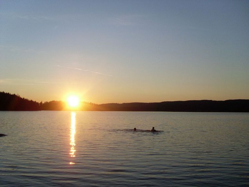 Deze morgen worden we wakker van de wekker en we staan om 8.30 uur op. Tegen tienen zijn wij al klaar om te vertrekken, maar Jenny zit achter de laptop en moet nog even een aanvraag voor een B&B boeking beantwoorden en één andere annuleren. Wij laten in deze vakantie de boekingen gewoon doorgaan, maar laten niet weten dat wij op vakantie zijn. Inmiddels krijgen we wel elke dag een paar telefoontjes en dat is best wel lastig als je op vakantie bent. Daarom gaat Jenny vanavond Paul en Mark bellen om te vertellen dat haar telefoon tot nader order wordt uitgezet. Via de mail zullen we de boekingen wel regelen. Het is dus tegen half elf dat we van deze camping met Nederlandse eigenaren vertrekken. Het zijn zeer gastvrije mensen die er alles voor over hebben om het hun gasten naar de zin te maken. Wij krijgen nog een folder mee over “Rondje Zweden” waar alle Zweedse campings met Nederlandse eigenaren in vermeld worden. In Malung doen we boodschappen en hoewel we deze plaats vaker bezocht hebben is het even zoeken naar een supermarkt. Uiteindelijk vinden we een Hemköp. We vervolgen Weg 45 naar Mora, waar we lunchen aan het water. Ook deze plaats kennen we aardig goed: we hebben er eens geslapen in de buurt van het station en een keer gekookt bij een rozebottelstruik met veel wespen. Ook hebben wij daar eens een vlot gezien met een caravan er op. We besluiten even te shoppen, want er zijn leuke winkels en Jenny heeft een vest nodig. Dat vinden we niet, maar wel een leuk shirt voor Nico. Zo’n Hawaï-achtig shirt wat we ooit bij het “Hoge Duin” in Frankrijk hebben gekocht, maar dan nu met oude auto’s en VW-T2’s. Heel leuk en Nico krijgt hem van mij alvast voor zijn verjaardag. Inmiddels is het erg warm en zeer zonnig geworden en daar genieten wij van. We vervolgen Weg 45 alsmaar noordwaarts, Östersund is uiteindelijk ons doel voor morgen. Onderweg zien we tweemaal een vos: één doodgereden en één wandelend langs de weg. Bij Ytterhögdal pauzeren we even en overwegen of dit onze nachtplek wordt. Wij hebben hier al eens eerder geslapen met Paul, die toen zo’n mooie duik van de hoge steiger nam, net op het moment dat ik de camera afdrukte. Die steiger ligt er nu (nog) niet en de overnachting kost SEK 50,00. Dat vinden we niet erg, maar we moeten het bij de Turistbyra voldoen en dat zien we nergens. Dus na een korte pauze in de zon rijden we verder over weg 45, de Inlandsvägen. Net voorbij Rätan zien we een natuurcamping. Het blijkt een vrije kampeerplaats met (pomp-) water en “poepdoos” te zijn, waar je voor SEK 40,00 een nachtje mag verblijven. Gewoon formuliertje invullen, geld in het envelopje doen en dan in de brievenbus. Wij kenden het wel, maar hebben het lang niet meer meegemaakt. Er staan meer kampeerders: twee caravans een camper en een tentje. In de laatste nota bene een gezin met 3 kleine kinderen. Voor wie deze plaats ook eens wil bezoeken: N62.49000 O014.48579. We staan in een mum van tijd in de kampeerstand en Nico kookt/bakt een heerlijke maaltijd, terwijl Jenny in het zonnetje dit epistel schrijft. Nog even en wij kunnen het bekende deuntje (van Grieg) neuriën, want wij zullen straks waarschijnlijk ‘de zon in de zee / het meer zien zinken’. Een ultiem vakantiegevoel!