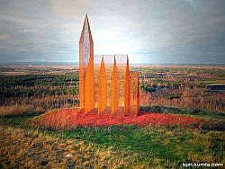 Je bevindt je op de top van de 100 meter hoge Kvarntorpshögen, het grootste overblijfsel van Zwedens industrie en tegelijkertijd een machtige kunstexpositie in de vrije natuur. De lucht is verzadigd van een olieachtige lucht die je neus prikkelt. Ergens diep in de berg brand het en af en toe kringelen er rookpluimen op plaatsen waar je beter niet kunt komen en die gemarkeerd zijn met waarschuwingsbordjes “Hett område” (hete omgeving) .