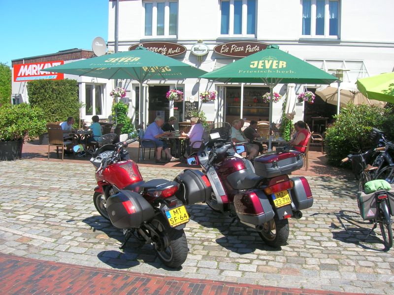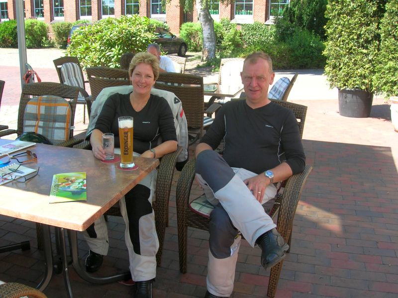 Lekker gevuld klimmen wij weer op de brommers voor het laatste stukje naar Pension Breitner in Loxstedt-Wiemsdorf. Daar arriveren wij om kwart voor vier en worden allerhartelijkst welkom geheten door Frau Breitner. Ze kent ons nog van verleden jaar. Terwijl ik dit schrijf zitten wij heerlijk in de schaduw in de tuin met een kopje thee.
