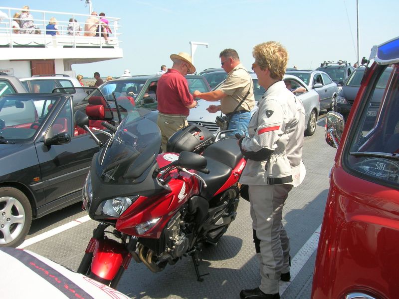 Na een herberekening van de resterende route zitten wij weer op het goede spoor. In het plaatsje Aukrug stoppen wij nog even voor een drankje en om 10 voor 4 rijden wij het parkeerterrein bij de boot op. Daar was het al gezellig druk met vooral Zweedse motorrijders. Later sloten er ook nog twee Nederlandse motorrijders aan.