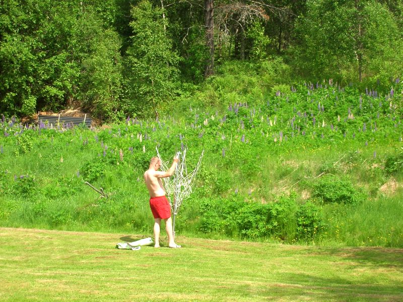 We pakken direct de koffers uit en geven al onze spullen een plekje. Heerlijk vertrouwd weer om in dit huis vakantie te vieren. Nu nog even de boodschappen in Munkfors doen. Het weer is inmiddels ronduit fantastisch geworden en de regenpakken ritsen wij er dus maar weer uit. Om een uur of drie zijn wij weer thuis en installeren wij ons heerlijk op de veranda met een drankje, een hapje en een krantje.