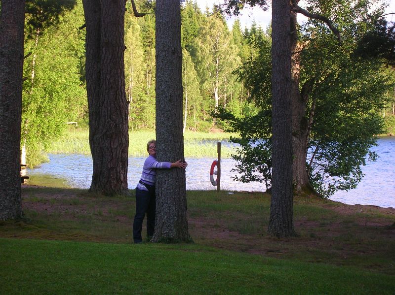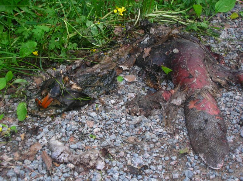 Om een uur of vier komen wij aan bij Edsleskogs Värdshus. Wij drinken eerst maar eens even lekker iets op het terras in het zonnetje. Daarna eten we nog even wat heerlijke verse broodjes met ham, kaas, brie en paté. Na het eten gaan we een lekker stukje wandelen. We lopen over een gruisweg langs het meer. Na een tijdje ligt er een dode bever in de berm. Zo te zien, maar vooral zo te ruiken, ligt hij er al een aardig tijdje.